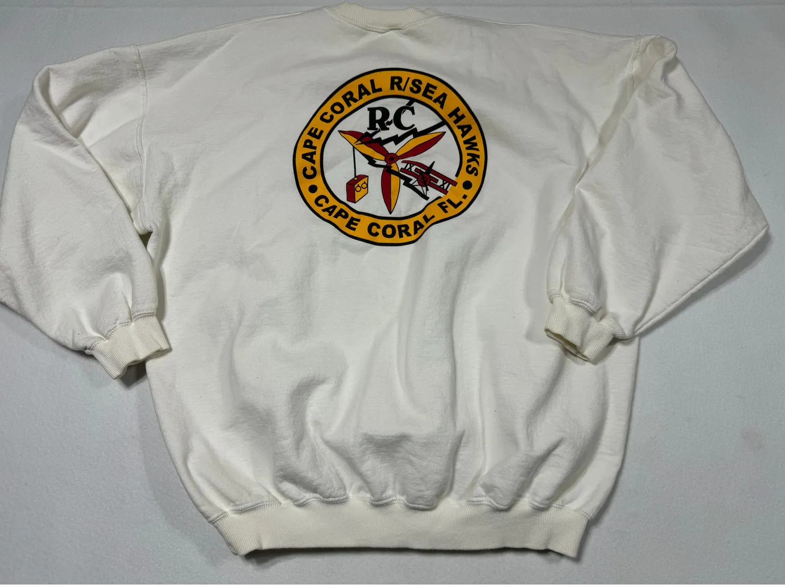 Cape Coral R/Sea Hawks vintage crewneck sweatshirt in white. Features a small front logo and a large colorful graphic on the back. Made from a cotton-polyester blend with a soft fleece lining. Ribbed cuffs, collar, and hem for a comfortable fit. Approximate measurements: 27-inch chest, 28-inch length. Size XXL. Perfect for collectors, aviation enthusiasts, or casual wear. Vintage condition
