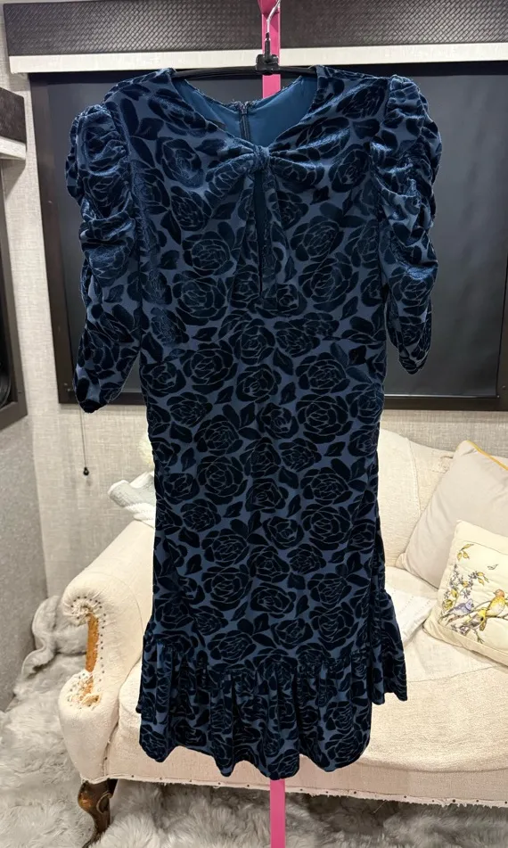 Chic navy velvet dress with floral design. Long sleeves and ruffled hem. Ideal for elegant occasions. From Anthropologie store. Has some stretch Comes from a non-smoking hypoallergenic, dog, friendly RV life home. Pit is 20 Length 37