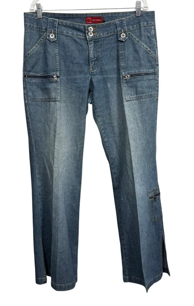 These pre-owned vintage Y2K Arizona Jean Co women’s jeans are in good condition. They feature classic early-2000s details including multiple zip pockets on the front, back, and leg, a double button waist, and slit hems. The light wash and straight fit give them a true retro utility look. Made from 98% cotton and 2% spandex for a bit of stretch. The jeans are size 13. Approximate lay-flat measurements: Waist: 18 inches Rise: 9 inches Inseam: 31 inches Length: 40 inches