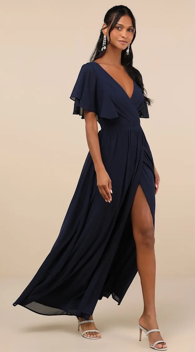 Lightweight woven chiffon shapes short flutter sleeves that frame a surplice bodice with subtle pleating and a low V-back. Internal ties thread through the banded waist, securing the wrap silhouette. Skirt has a flaring, overlapping design that falls to a maxi hem.