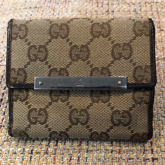 GUCCI Brown Canvas Jacquard GG Trifold Wallet Brown Leather Coin Purse Credit Card Bill Fold GUCCI... Show more