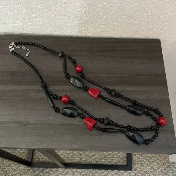 Black and red resin beads. Double strand. Approximately 38 inches long with a 4 inch silver tone ext... Show more