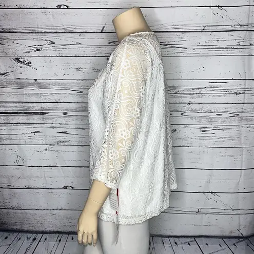 Ruby Rd. Woman Size 2X White Lace Overlay Blouse & Tank Top. 3/4 Sleeves. Body is Nylon/Spandex Blend - Lining is Polyester. NWT, Brand New with Tags. Length is 26.5” & Bust is 25”. Measurements taken while garment is laying flat.