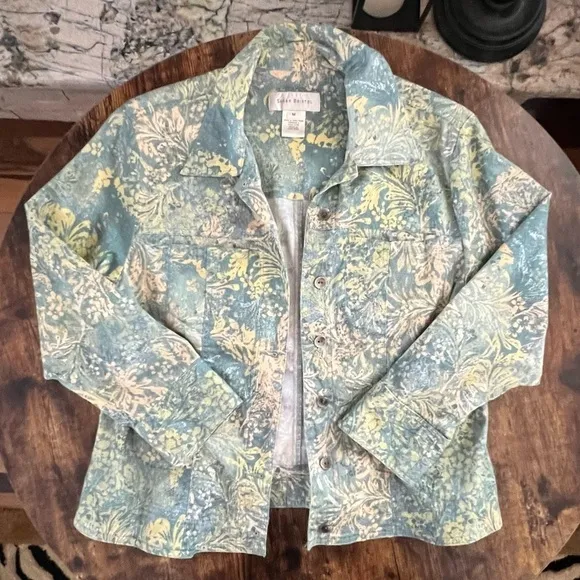 . Colors: teal/blue/green, yellow, muted colors. 98% cotton, 2% spandex. Beautiful collared, 3/4 length sleeved, light weight, button up front jacket. 7 button, up front. 2 front pockets on chest. Beautiful lightly beaded areas, with small beads, on coat. Like new condition. Very cute with jeans! PIT2PIT: 19”. LENGTH: 24” SLEEVE: 20” #blazer #coat #jacket #SusanBristol #beaded #vintage #ladies #womens #juniors #coldwatercreek