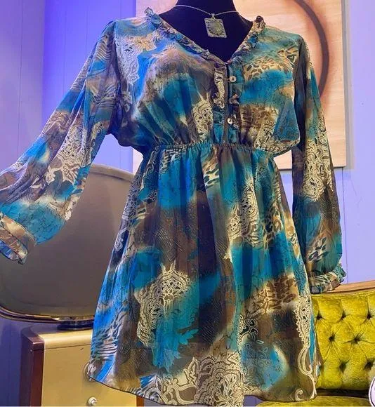 Vintage Y2K Notations Animal Print And Paisley Semi Sheer Boho Fairycore Tunic Top Serve peak Y2K vibes with this dreamy Notations semi sheer tunic top! Featuring an eclectic mix of teal, brown, and gold animal print and paisley abstract patterns. This blouse brings just the right mix of boho, glam, and early-2000s sass. Perfect for layering over a cami or bralette, it’s the statement piece your wardrobe’s been waiting for. Size medium Pit to pit 18” Waist (elastic) 14”-16” Length 27” In excellent condition