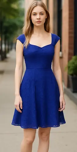 Cap sleeve lace cocktail dress with slight flare at bottom 61% Rayon, 39% Nylon Lace Cocktail dress... Show more