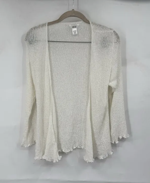 Great pre owned condition Sheer fabric with an open front style One size but fits best at a small-medium Lightweight and breathable. Cute dainty lettuce hem. All measurements are approximate: 21 inches pit to pit. 14 inch sleeve from cuff to pit. 25 inch length from shoulder to bottom hem. M17