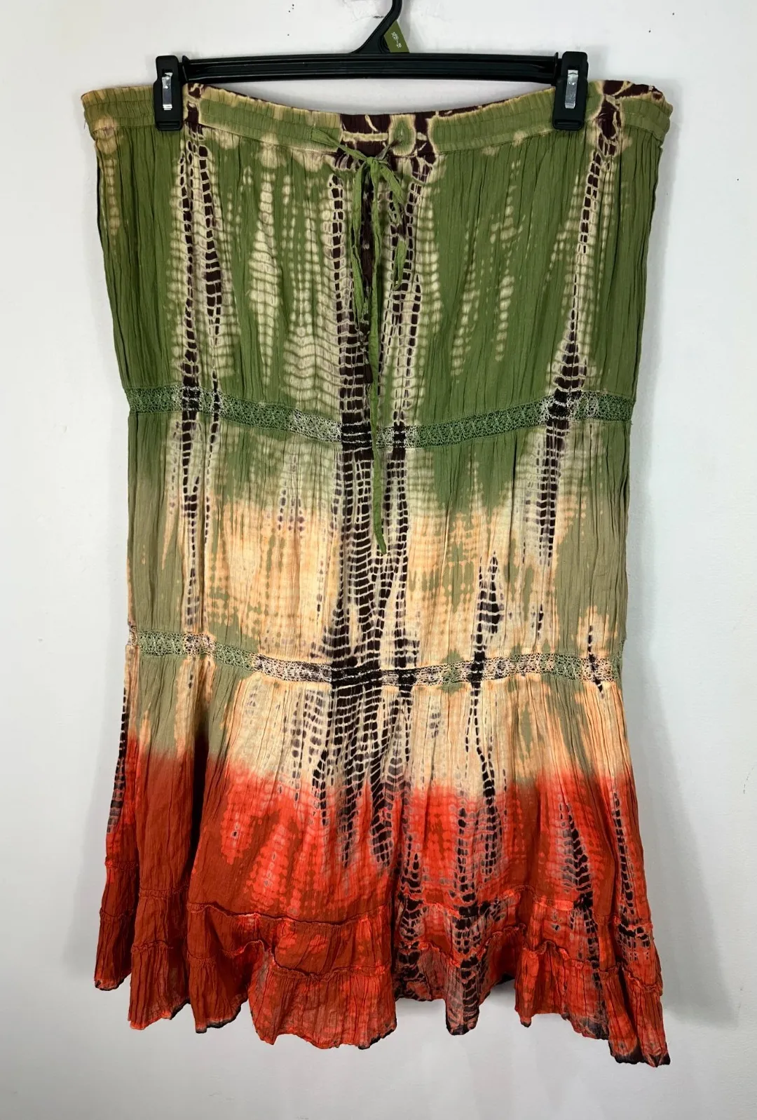 used condition. Tie waist not a stretch band. BRAND: Kaktus SIZE: XL COLOR: Green with tan brown and rust ombré MATERIAL: 100% Cotton MADE IN: India boho, hippie, earthy, festival, cottagecore, gypsy, indie, nomad, artwear, granola core, natural fibers, relaxed fit, summer skirt, travel style, coastal boho