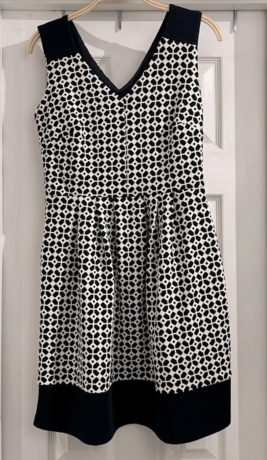Description: Dark navy blue and white geometric pattern dress. See picture held up to something black. Flattering v-neck. Aline style. Size: Small Fabric: 95% polyester, 5% spandex Approximate measurements lying flat: pit to pit 15”, length 33.5” Condition: Excellent gently used condition
