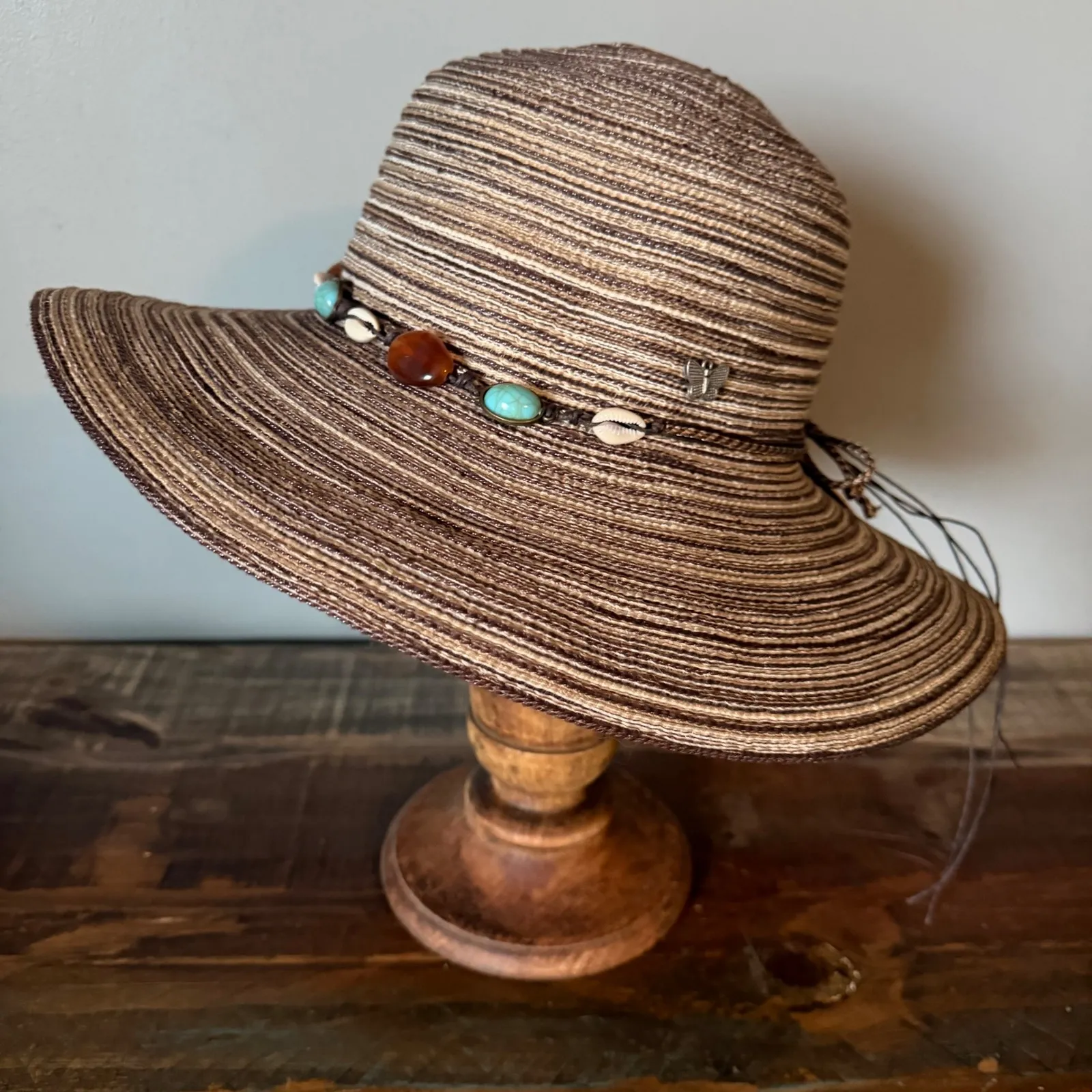 Adorn your sunny adventures with this charming Kallina wide-brim hat, a perfect blend of style and sun protection. Its woven texture in rich brown and cream stripes creates a sophisticated yet relaxed look, while the decorative band featuring turquoise stones, amber beads, and delicate seashells adds a touch of bohemian elegance. The subtle butterfly charm offers a delightful detail, and the wide brim provides ample shade for your face and neck. The integrated UPF 50+ rating ensures you can enjoy the outdoors with confidence. Ideal for beach days, poolside lounging, or leisurely strolls in the park. New with tags Keywords: Kallina hat, sun hat, beach hat, vacation hat, wide brim, boho, beaded, seashells, striped, UPF 50, summer accessory, travel, outdoor, fashion