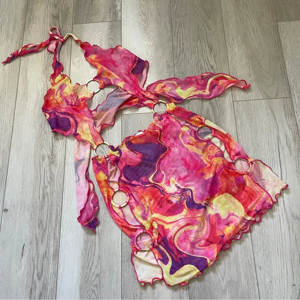 Kamari Capri Groovy Mesh Dress in the color pink. Plunge neckline, cutout detailing, with rings on sides of skirt. Halter tie + back closure. Mini length. Lightweight, stretchy, bodycon mesh fabric. Size small, womens. In great pre-worn condition, like new. 95% polyester, 5% spandex. Made in USA. Super cute bright, colorful, vacation, resortwear, going out, sexy, party style. Perfect for beach, swim, pool, travel, spring summer. The pink tropical print Cut-Out Mesh Dress is one of our favorite pieces and promises to be the next hot wardrobe staple this summer. Feel like your best self wearing this versatile piece as a dress or coverup that takes you from the beach or pool to town. //B749, 3.6