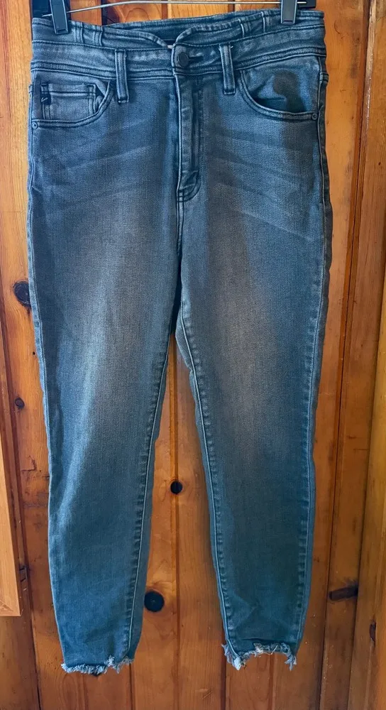 Stylish and versatile skinny jeans in a faded gray wash. These KanCan jeans feature a modern ankle length with a trendy frayed hem. The denim has a comfortable amount of stretch, making them perfect for all-day wear. These jeans are a great addition to any wardrobe, easily dressed up with heels and a blouse or dressed down with sneakers and a tee. Ideal for casual outings, weekend adventures, or even a relaxed office environment. Style: Skinny Color: Black/Gray Department: Women Type: Jeans Fabric Wash: Charcoal Wash Accents: Button, Logo Features: Frayed Hem, Stretch Denim, Ankle Length, Pockets Pattern: Solid Fit: Skinny Waist Size: 28in Keywords: KanCan, skinny jeans, ankle jeans, frayed hem jeans, gray wash denim, women's jeans, denim pants, casual jeans, stretch denim, size 28 , high waisted jeans, distressed jeans