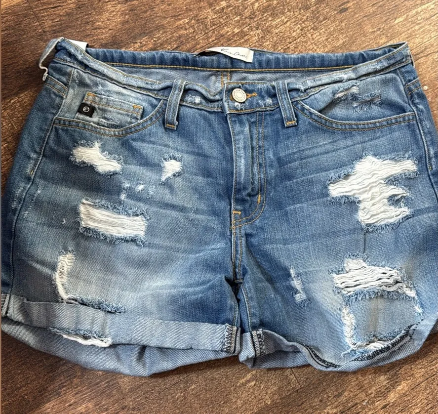 Like new condition Size 26 High rise jean shorts Distressed throughout Material is 100% cotton. They do have slight stretch to them. Almost all distressing or holes are in like new condition with nearly all material still attached Very nice shorts for any occasion Spring, summer