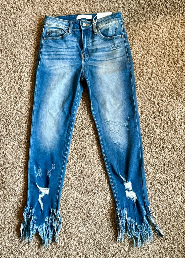Step up your denim game with these stylish KanCan Ratana high-rise skinny jeans, featuring a flattering dark wash and eye-catching frayed fringe ankle hems. Designed to hug your curves while offering comfort, these jeans combine classic skinny styling with a modern, distressed edge. Perfect for those who are in between sizes! Crafted with KanCan’s signature stretch denim, the high-rise waist provides a smoothing, supportive fit, while the ankle-length cut makes them perfect for showing off your favorite shoes. Light distressing at the knees and raw fringe hems add just the right amount of attitude. Perfect for: everyday wear, casual outfits, boho style, fall layering, or weekend looks. Details: Brand: KanCan Style: Ratana Women’s skinny jeans High-rise fit Dark blue wash Ankle-length cut Distressed knee details Raw frayed fringe hem Zip fly with button closure Classic 5-pocket design Stretch denim for comfort Flattering, modern silhouette Pair with boots, sneakers, or heels and a cozy sweater or fitted tee for an effortlessly chic look.