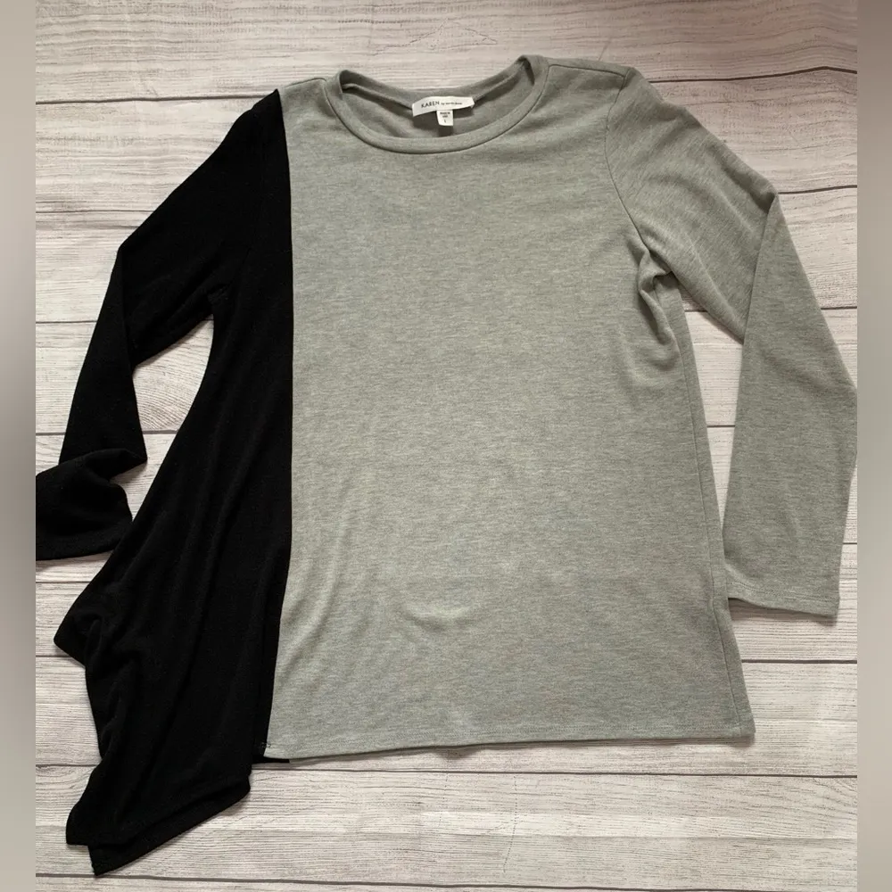 This is a Karen by Karen Kane Gray/Black Asymmetrical Hem Lightweight Sweater Top in L. Minimalist... Show more