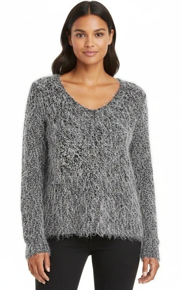 Long sleeve Fuzzy texture Shaggy knit Pullover V-neck Stretch Soft feel Lightweight No material tag... Show more