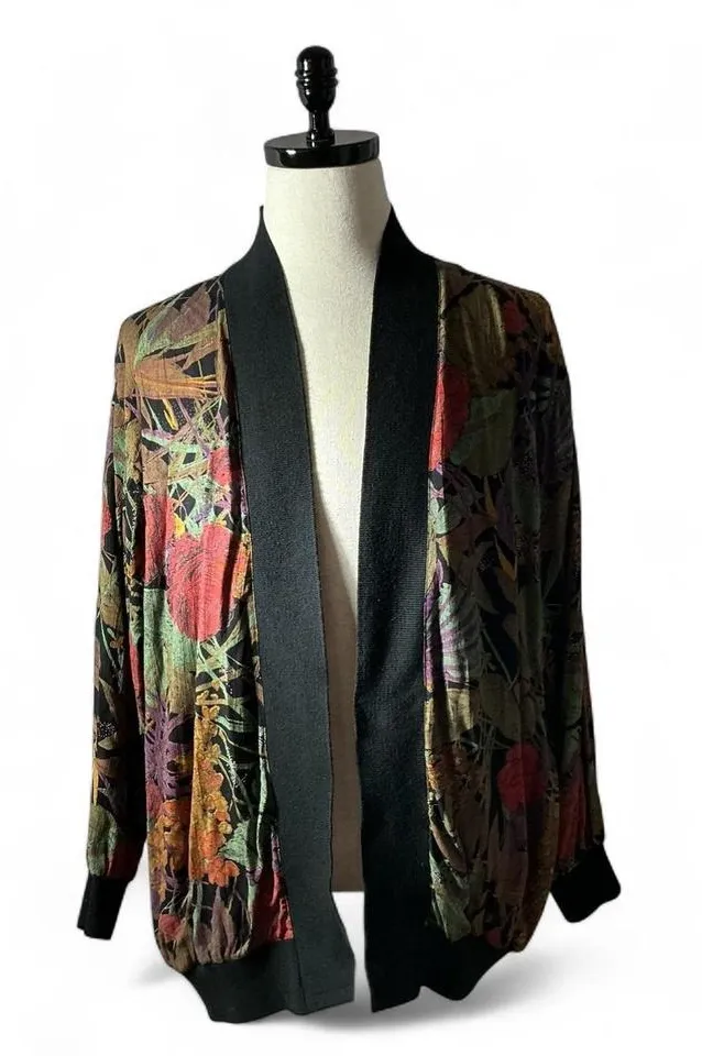 Karen Kane Floral Print Open Front Cardigan Jacket Black Trim Eye-catching open-front cardigan jacket, featuring a vibrant floral print in shades of red, orange, green, and purple against a black background. This jacket boasts a comfortable, relaxed fit with long sleeves and a black ribbed trim along the open front and cuffs. The design offers a stylish and versatile layering piece, perfect for adding a pop of color and pattern to any outfit. Keywords: floral cardigan, open front jacket, floral print jacket, vintage cardigan, retro jacket, black trim cardigan, womens cardigan, casual jacket, boho cardigan, bohemian jacket, koretane jacket, floral print, long sleeve cardigan #FloralPrint #VintageStyle #RetroFashion #CardiganJacket