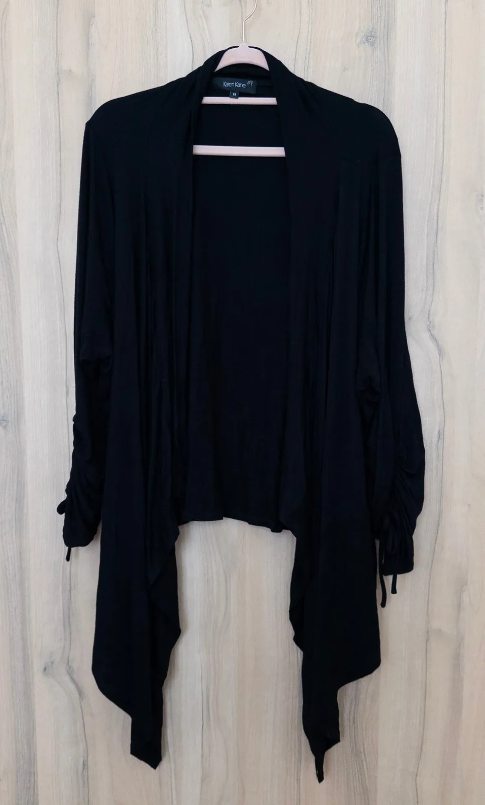 Karen Kane black open front cardigan sweater. This stylish piece features a flattering drape front silhouette and chic ruched detailing on the sleeves with tie accents. Perfect for layering over a casual outfit or dressing up for an evening out, this cardigan is ideal for brunch with friends or a relaxed dinner date. *Check last photo for approx. measurements, taken flat lay* Style: minimalist, chic, elevated basics, quiet luxury, classic style, capsule wardrobe, modern casual, soft drape, versatile, timeless Condition: Excellent condition. No visible flaws. See all photos for details. Ships next business day. Bundle deals available. Smoke-free home. Please check measurements before purchasing.