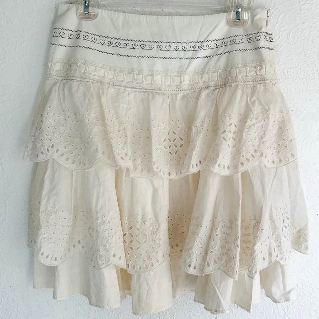 Romantic vintage Y2K mini skirt by Karen Millen England in the dreamiest soft ivory. Features layered eyelet lace tiers, delicate heart embroidery at the waist, and a floaty silhouette. Side zip closure. Fully lined. Cotton Excellent preowned condition ▫️Waist-15” ▫️Length-20” Measurements are approximate coquette, cottagecore, fairycore, soft girl, balletcore, y2k, milkmaid, romantic, lace skirt, eyelet lace, ruffle mini skirt, prairie, whimsigoth, boho