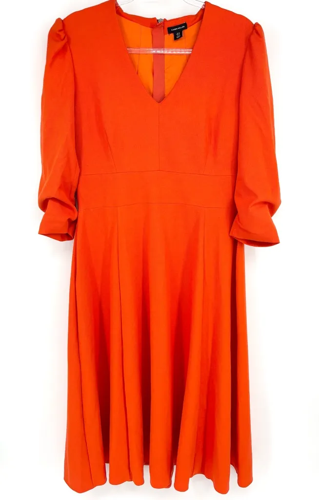 Karen Millen Structured Crepe Full Skirted Midi Dress Size 12 Color - Orange This is a Karen Millen Structured Crepe Full Skirted Midi Dress in orange From mother of the bride outfits to wedding guest dresses, mark the moment with our timeless collection of wedding outfits. Crafted from signature structured crepe material, this midi dress exudes a luxurious feel. Padded shoulders add a directional element, while a fluid midi skirt exudes understated elegance. Style this piece with strappy heels for a refined desk-to-dinner ensemble. Style: Midi Dress Design: Plain Fabric: Woven Length: Midi Neckline: Notch Sleeve Length: 3/4 Sleeve Condition Very good overall, small mark on shoulder that is not really noticeable when worn See photos Measurements are approx. Waist 16.5” Chest 19.5” Length 49” All items ship from a pet and smoke free environment Fast shipping Classic , timeless , capsule wardrobe , refined Modern , British , Kate Middleton , Princess Royal designer , sophisticated , work , professional Church , modest , Easter , spring Bin - HU