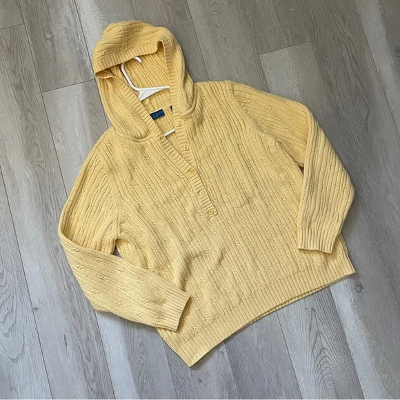 Fisherman Cable Knit Sweater Hoodie in the color Yellow. Brand is Karen Scott. Hooded, 3/4 button closure, long sleeve. Ribbed cable knit, fisherman design. Heavyweight. Size xlarge, womens. In great pre-worn condition, no major issues. 100% cotton. Super cute classic, fisherman, coastal, timeless, casual, fall winter style. //1.7.9