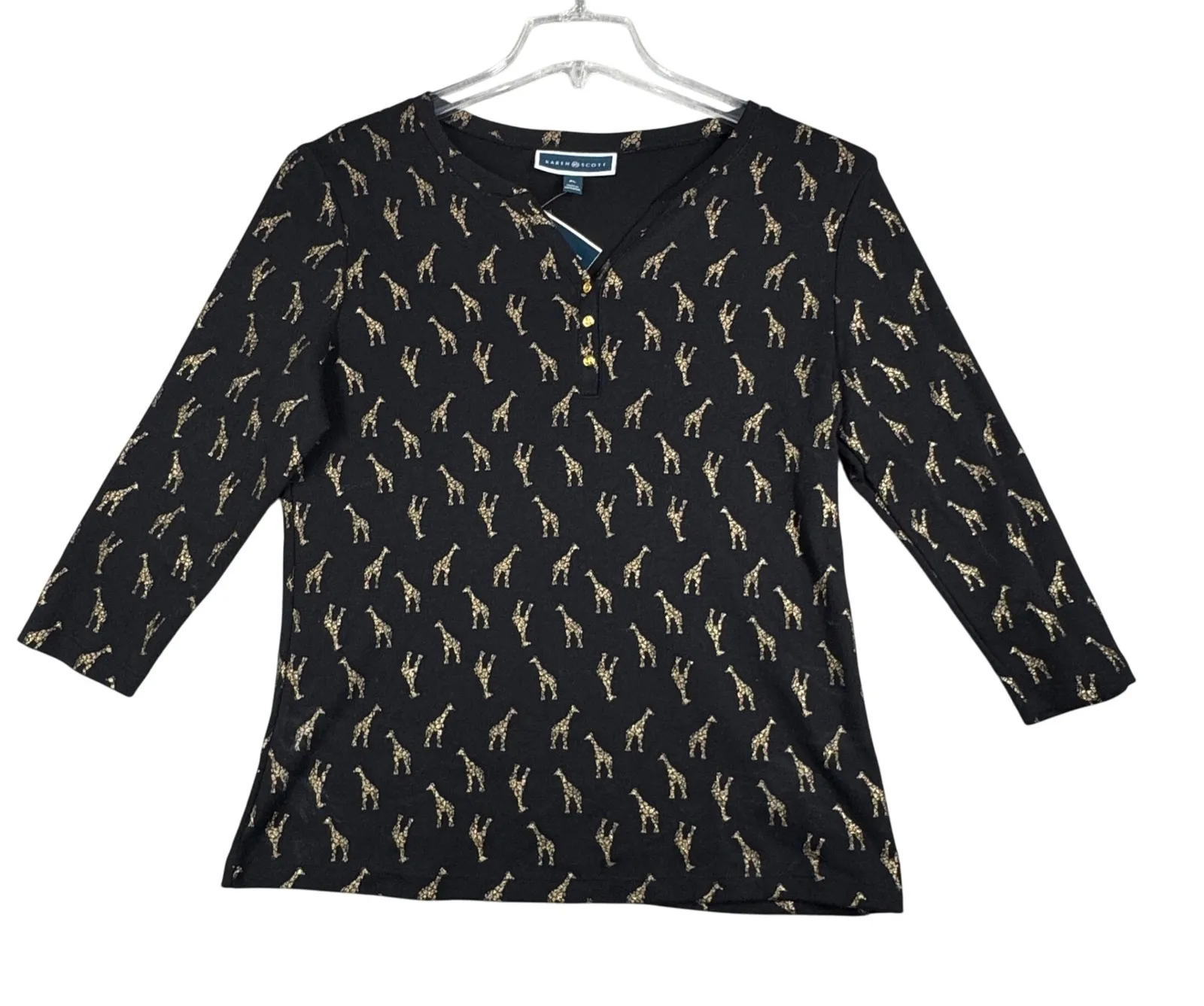 Karen Scott Shirt Black Gold Giraffe Print 3/4 Sleeve Novelty Size Large Petite Women's Size Large... Show more