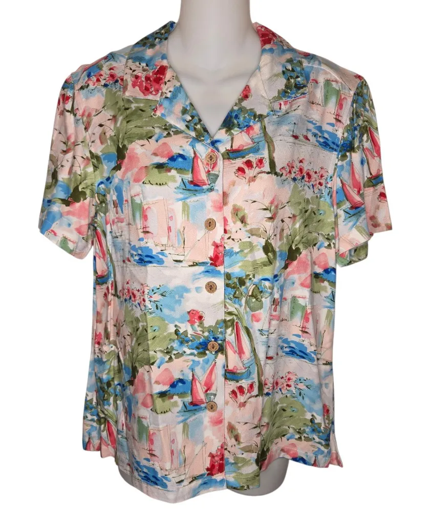 Excellent like new condition. No flaws to note. Karen Scott Sport Vintage Nautical Print Rayon Button Down Blouse Shirt Top Med. vintage 90s ornate wood buttons short sleeve collared vibrant boating, sailing, nautical abstract print side hem vents All measurements are approximate Bust 40" ptp 20" Length 24" vtg, vacation, tropical, floral, palm leaf, getaway, cruise, summer, beach, coastal grandma, classic, casual.