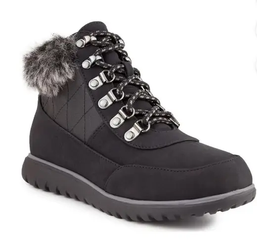 New in box. Karen Scott offer plenty of possibilities for comfort and style for the everyday woman. Womens Ankle Boots. Faux Suede Bootie. Round Toe. Round Toe Shoes Women's Boots. Material:Fabric/Man Made Materials Stay stylish and comfortable with these black fur-lined hiking boots. Perfect for outdoor adventures.