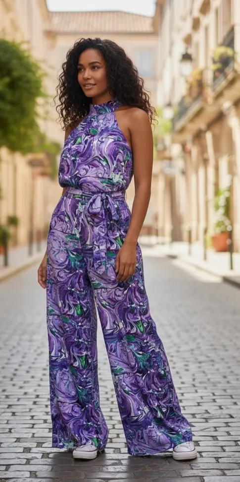 Kareno Halter Neck Wide Leg Jumpsuit which features a purple and green marble print with a waist tie that you can tie to hang loosely or in a bow. It also includes a peek a boo back. Size: S In excellent used condition worn 1x! 🛍️🛍️Questions? Ask before purchasing! Note: Model image is Al-generated and provided for visual reference only. It is intended to show how the garment may look when worn. The actual item for sale is the one shown in the product photos and may differ slightly in color, fit, or condition. Please refer to the detailed photos and description for accurate information about the garment including any flaws and measurements.