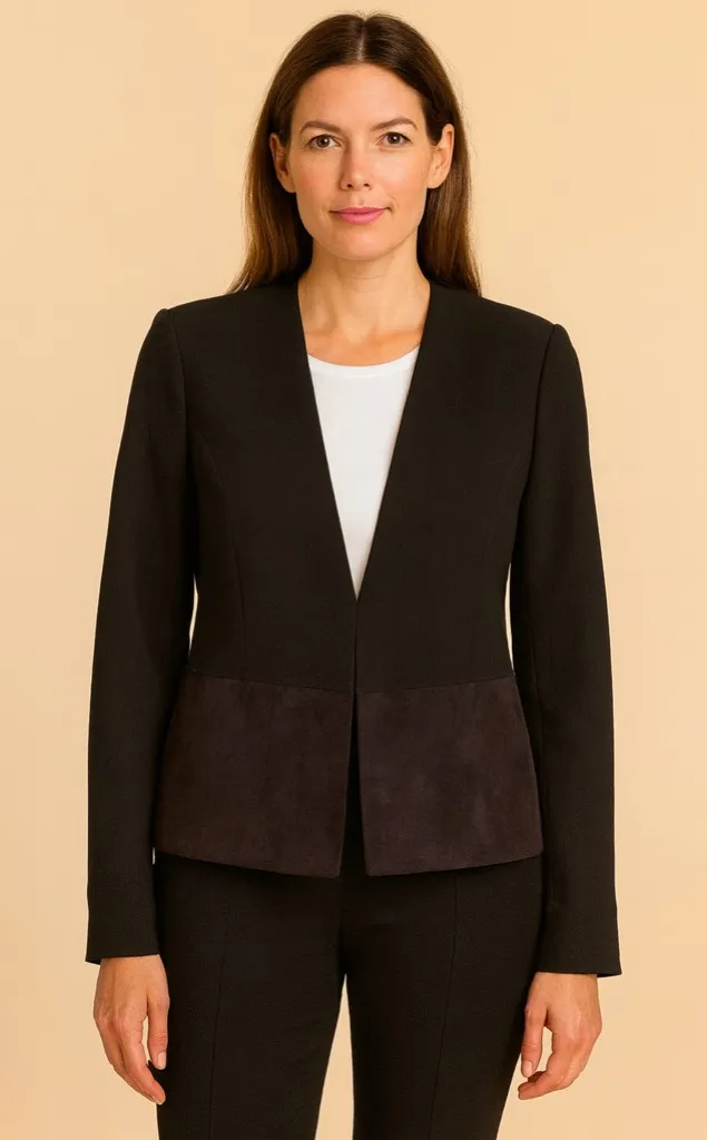 Preowned and in good condition! Chic gray hook closed front blazer with faux suede bottom.Ideal for office or evening wear. Tailored fit enhances silhouette. Fabric:Shell:63% Polyester 33% Rayon 4% Spandex Shell 2:94% Polyester 6% Spandex Lining:100% Polyester Measures:17.5” Underarm to Underarm and 13 ”aunderarm to Bottom