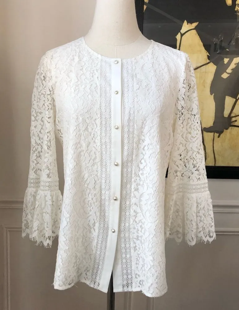Karl Largerfeld lace top with trumpet sleeves. Jewel neckline and button front with tiny silver logoed buttons. Torso is lined, sleeves are not. Baggie with extra button is still attached to the inside. 20” armpit to armpit