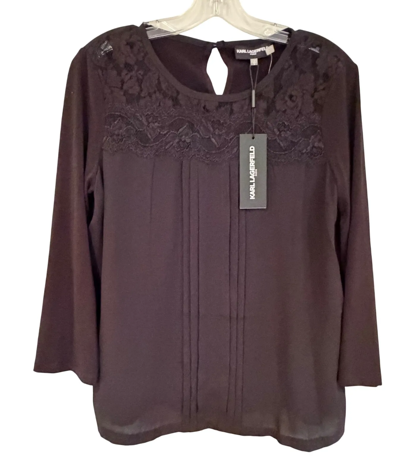 . NEW WITH TAGS! Elevate your wardrobe with this sophisticated KARL LAGERFELD black blouse, a true embodiment of refined elegance. Delicate floral lace graces the neckline and yoke, creating a captivating contrast against the smooth, flowing fabric. The thoughtfully placed pleats down the front add a touch of subtle texture and graceful movement, while the chic 3/4 sleeves offer a flattering silhouette. A charming keyhole detail at the back with a single button closure adds a refined finishing touch. Ships from a non-smoking home. Measurements: • PTP: 20" • Length (shoulder to hem): 24.5" Keywords: Karl Lagerfeld, black blouse, lace detail, pleated top, 3/4 sleeve, keyhole neckline, elegant, sophisticated, women's fashion, designer top, evening wear, workwear, chic
