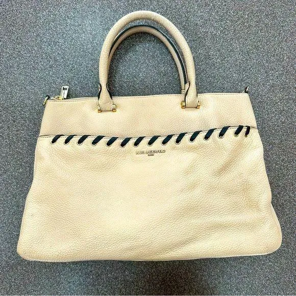 Karl Lagerfeld purse. Nice neutral cream color, has gold zippers and logo, and black lacing detail, a nice everyday size, clean and in good pre loved condition! Very soft leather. Pre Loved, Normal Wear. Missing Shoulder Strap
