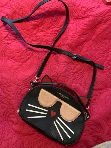 Adorably chic Choupette top-handle bag with patch graphics and a textured faux-leather finish. Top zip-around closure Goldtone hardware One back slip pocket One inside zip pocket Lined SIZE Adjustable, removable shoulder strap, 25" drop 8.5"W x 5.5"H x 2"D
