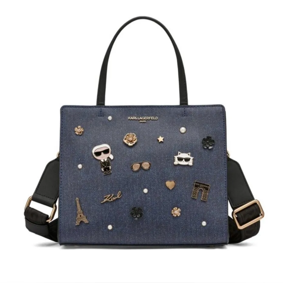 This très chic conversation starter of a satchel makes a statement against the sleek backdrop of a turtleneck and ankle jeans. Crafted of durable denim effect PVC, this structured satchel features playful pin embellishments across the front and a clean, modern silhouette. Dual top handles and a removable strap offer versatile carrying options, while a zip-top closure secures the interior storage. Exterior back slip pocket, interior front pocket and back zip pocket Includes detachable coin purse and care card Color: denim blue with black, red, gold, and white accents Measurements: approximately 10” W by 8” H by 5” D with about 18” drop on shoulder strap NWT in excellent condition with no flaws Smoke Free 🚭 Pet Free 🏠 Bundle and Save!