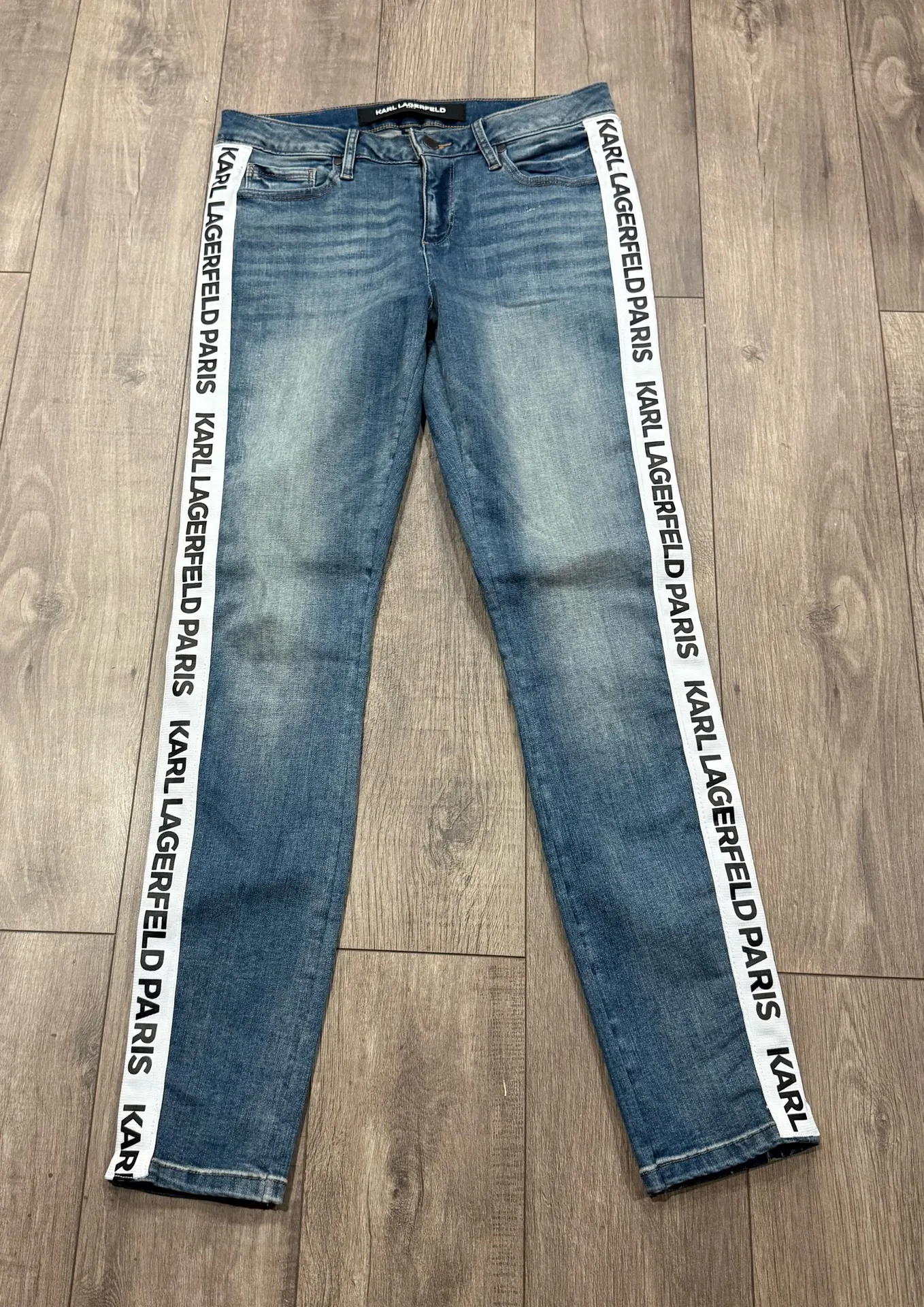 Karl Lagerfeld Paris blue skinny jeans featuring bold side logo. Sleek and stylish design. Ideal for a modern wardrobe. The style showcases standout branding with the logo tape, allowing for unapologetic self-expression. Size 8 in amazing condition Modern Lux Icon Statement