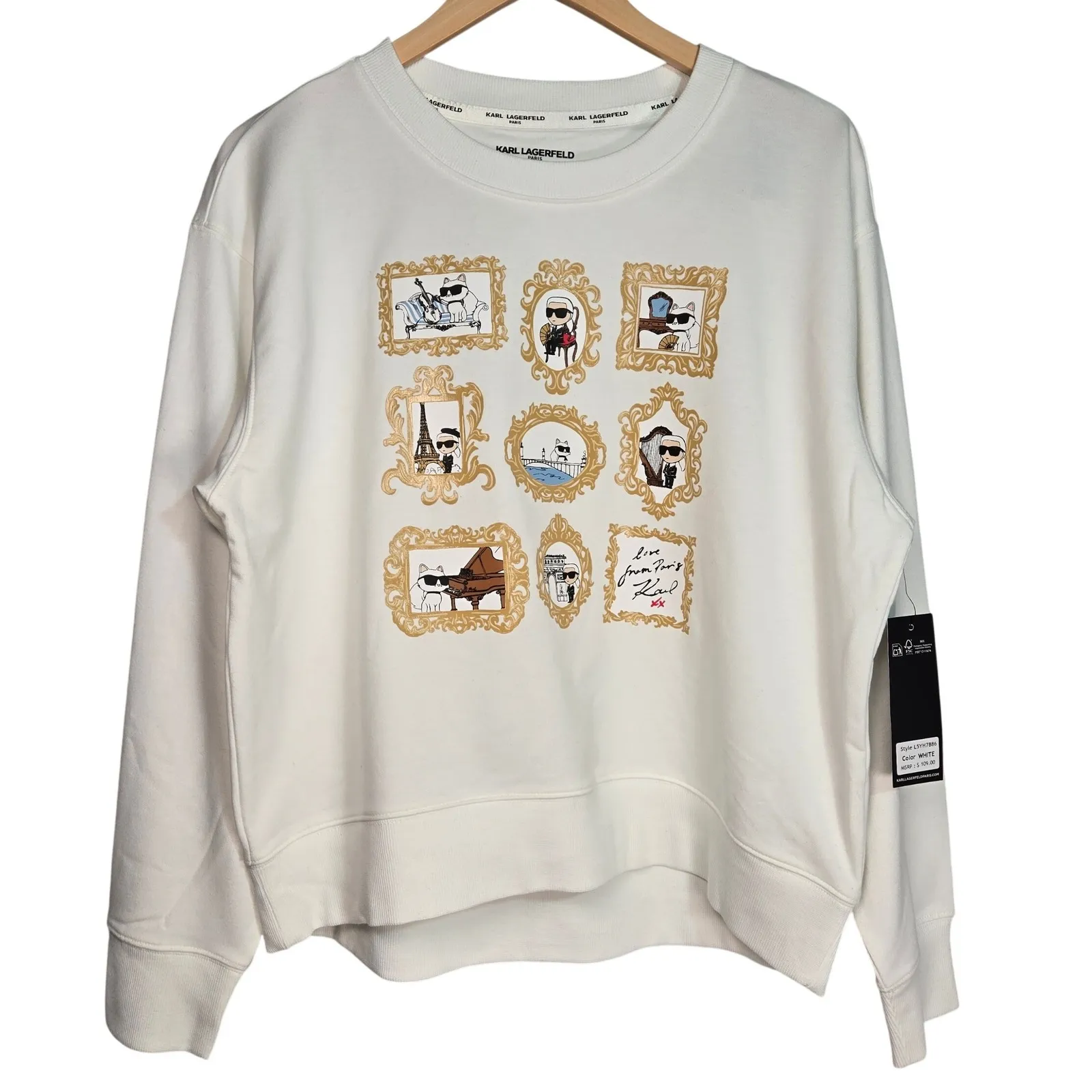 New with tags Size: M Style: L5YH7B86 Retail: $109 60% Cotton, 40% Polyester Measurements are in the photos. • Bust: 23 in • Length: 23 in Keywords: Karl Lagerfeld, crewneck, sweatshirt, graphic print, Parisian, designer, casual, streetwear, loungewear, cotton blend, long sleeve, fashion, whimsical, novelty