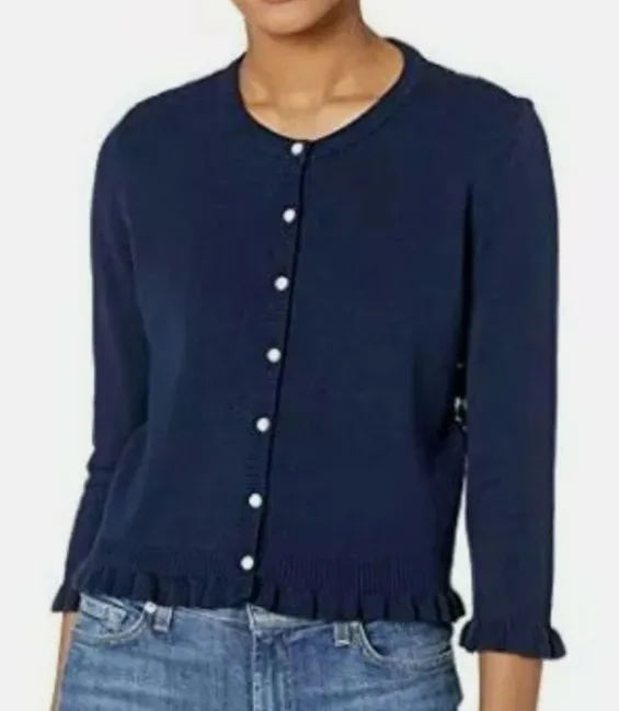 This Karl Lagerfeld Paris women's cardigan Chic cardigan featuring a lace back, pearl-style buttons, and ruffled cuffs and hem. Navy blue with a black lace back It has a crew neck, 3/4 length sleeves with ruffled cuffs, a ruffled hem, and a full button-front closure with faux-pearl buttons. The semi-sheer lace back and elegant details offer a mix of classic and chic style that can be dressed up or down. Perfect for layering. Women’s M GUC see measurements to insure an accurate fit. Thanks for looking! 9KL