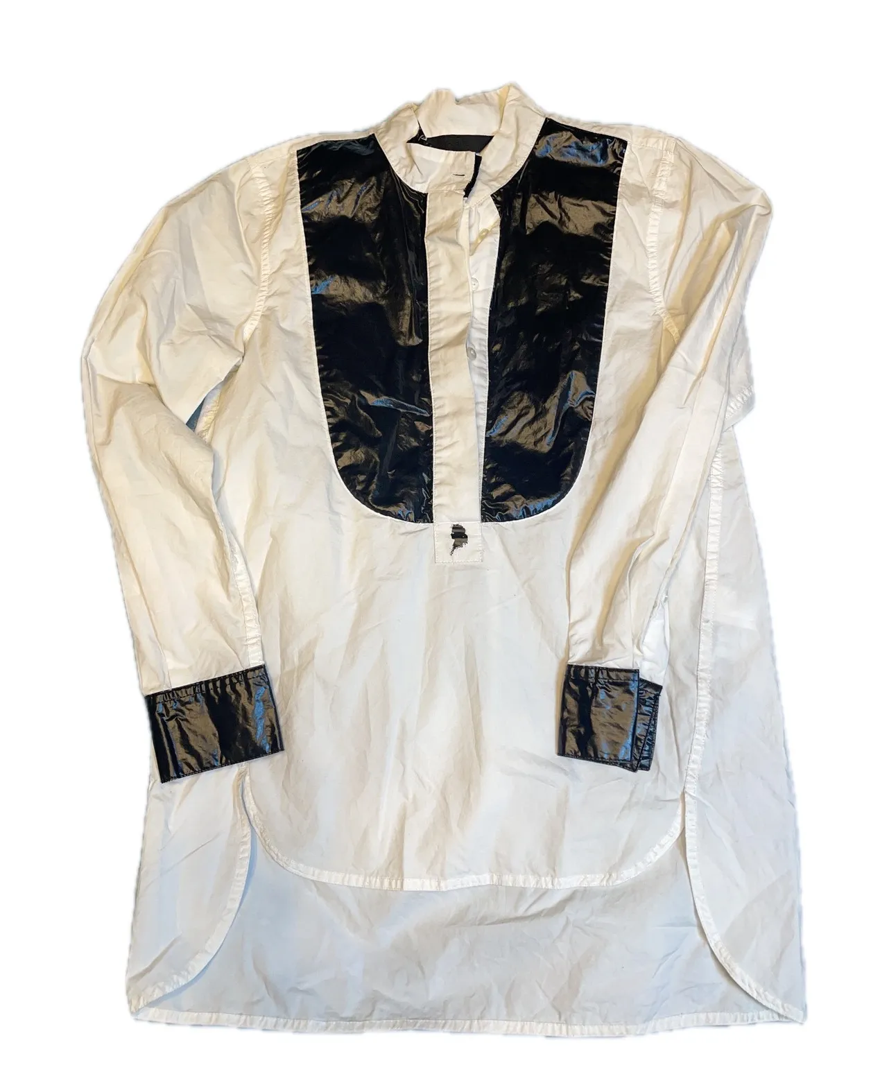 A chic Karl Lagerfeld white long sleeve shirt tunic featuring contrasting black patent tuxedo bib detailing and cuffs. The shirt showcases a unique high-low hemline and a single button closure at the neck. A small dark mark is present on the front bib area. The patent material on the cuffs appears slightly creased. The brand tag is Karl Lagerfeld. Measurements: • Chest: 24 1/2 in • Sleeve Length: 23 in • Shoulder Width: 15 3/4 in • Bottom Hem Width: 18 1/2 in Type: Button-Up Department: Women Style: Tunic Material: 100% Cotton, Patent Leather Neckline: Collared Sleeve Length: Long Sleeve Sleeve Type: Classic/Fitted Sleeve Pattern: Solid Keywords: Karl Lagerfeld, tuxedo shirt, patent detail, statement shirt, designer blouse, long sleeve, tunic shirt, high low hem, unique fashion, modern style, evening wear, chic, sophisticated