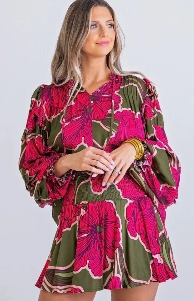 Karlie Magenta & Olive Floral Tiered Long Sleeve Blouse Good used condition, minimal signs of wear.... Show more