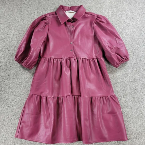 Karlie Womens Faux Leather Tier Dress S Red Puff Sleeve Collared Button Front Measurements: 17" Pit... Show more
