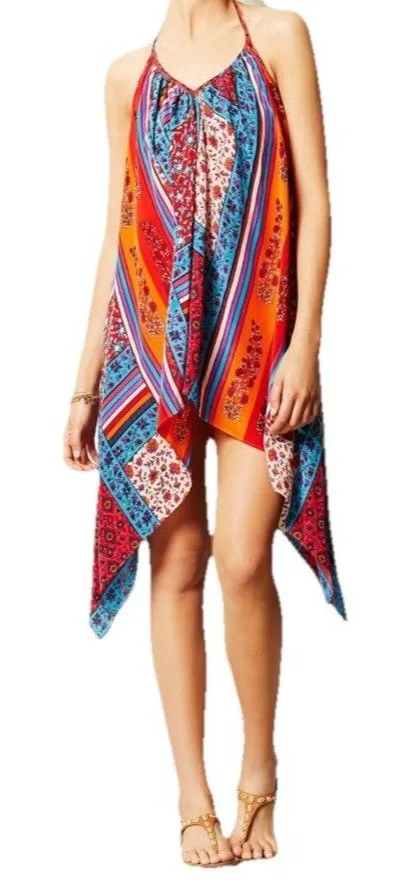 Kas New York 100% silk hankerchief hem mini dress cover up , tied halter neck , open back Size small Flat measurements across the under arms is 20 , from top of v neck to the hemline is 18, thats the shortest