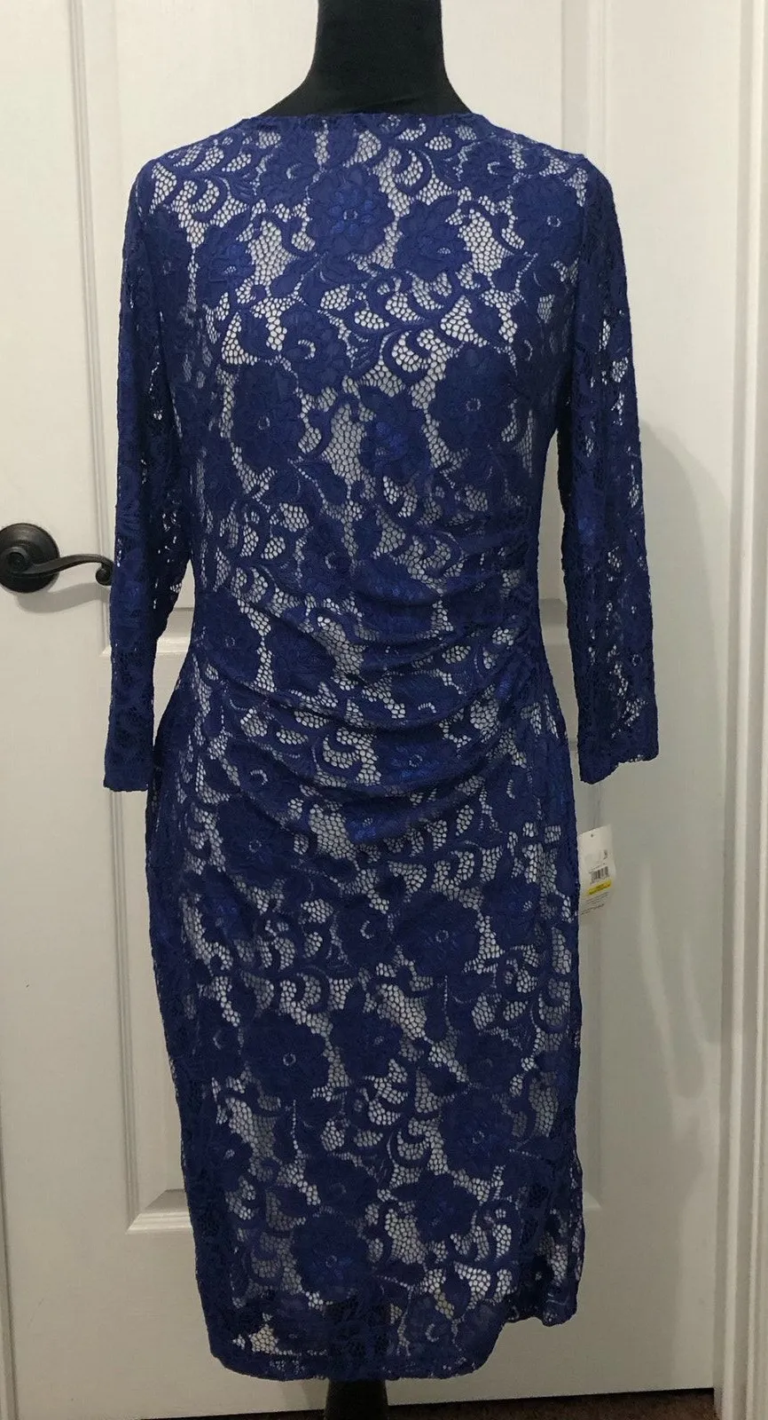 Kasper Laurissa Sheath Dress Sz Medium Royal Blue White Lace Floral Long Sleeve Condition: NWT Bra... Show more