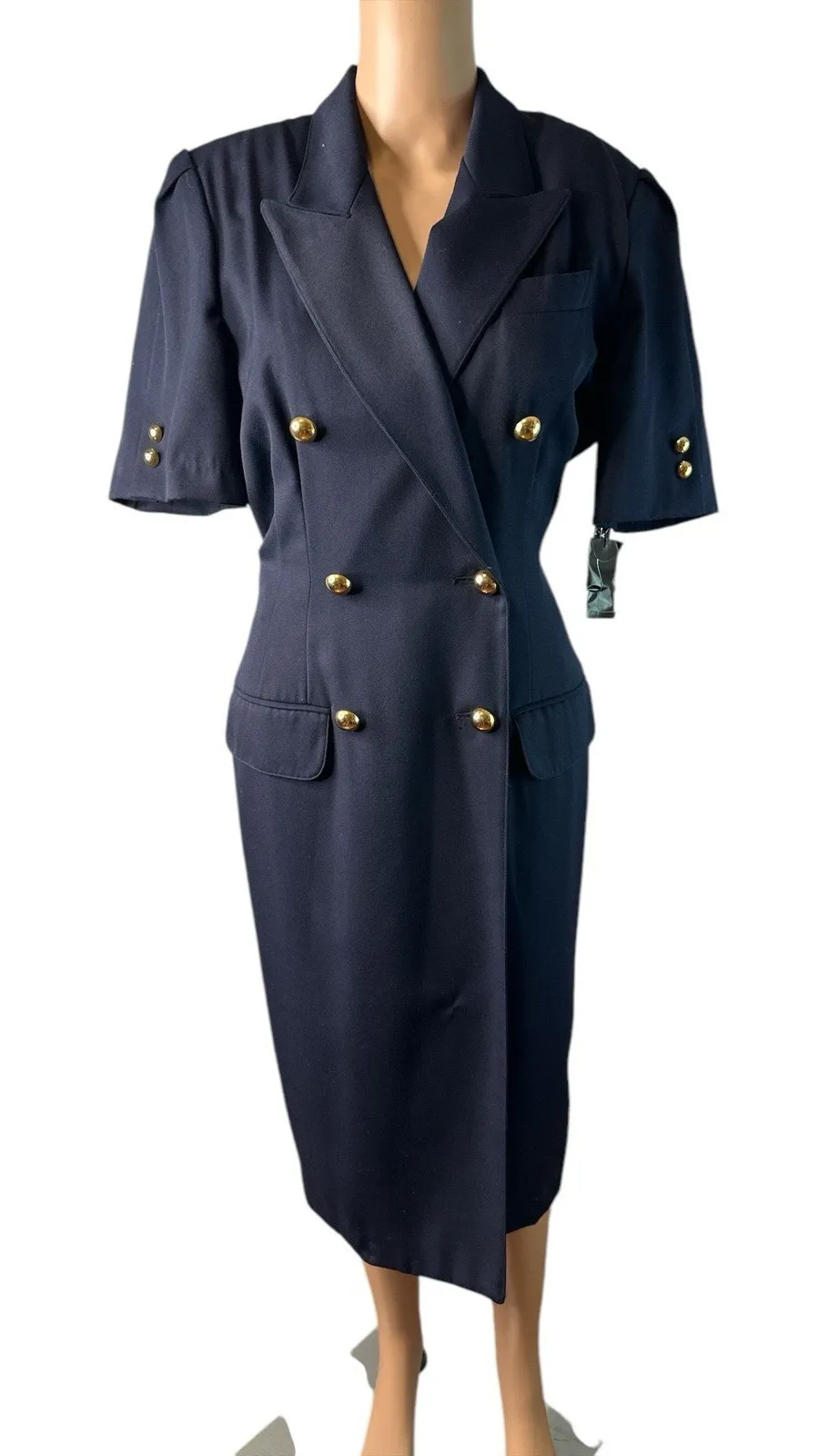 NWT 1980s Jasper Short Sleeve Navy Double Breasted Tuxedo Secretary Sheath Dress Measurements are a... Show more