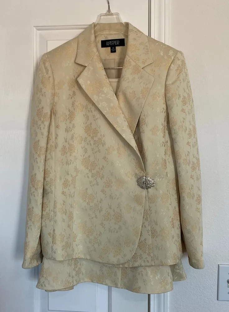 Size 10. This set is lovely! Pearl brooch closes the dress jacket. Tulip skirt! Soft yellow with lig... Show more