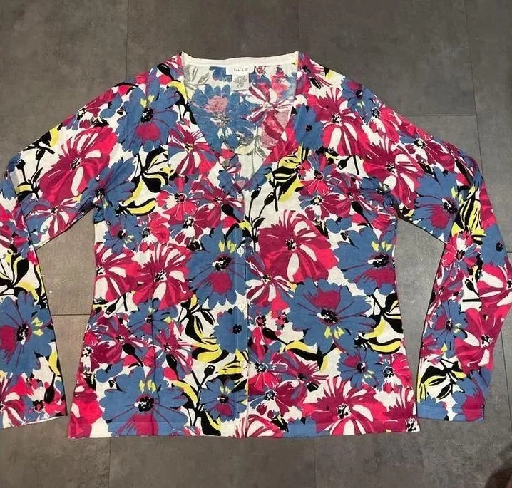 Elevate your summer wardrobe with this stunning Kate Hill floral blouse. Crafted from 100% cotton, this L/G size top features a vibrant pattern of pink, blue, and yellow blooms on a crisp white background. The eye-catching design is perfect for both casual outings and dressier occasions. With its comfortable fit and breathable fabric, this blouse is an essential addition to any fashion-forward closet.