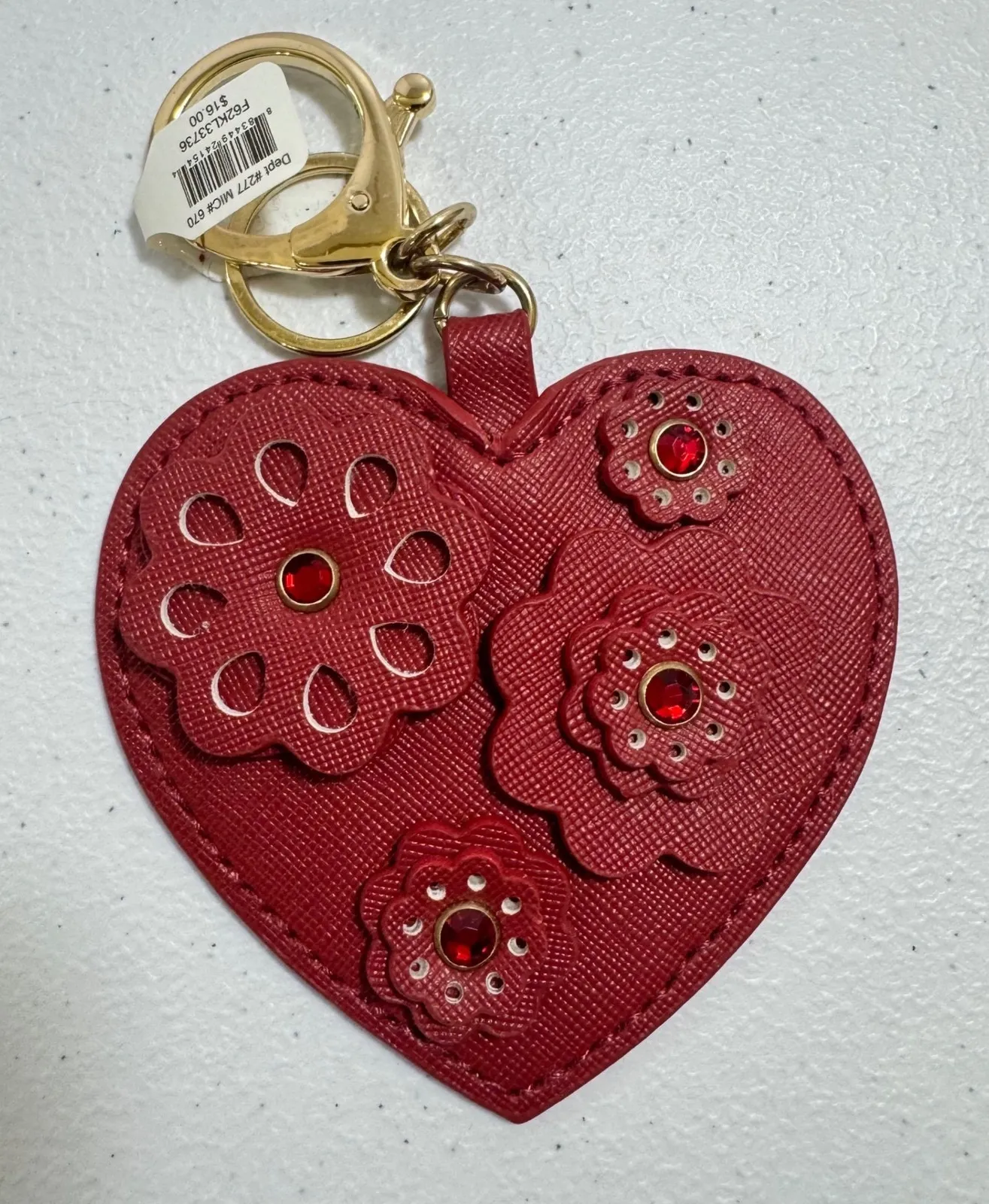 Adorn your favorite bag with this charming Kate Landry heart charm. Sparkling rhinestones nestled within delicate floral cutouts on a rich red background add a playful and romantic touch to your everyday style. The durable leather construction and secure gold-tone hardware ensure this charming accent will be a cherished accessory for seasons to come. Perfect for adding a pop of personality to your work tote, weekend crossbody, or travel duffel. Type: Key Chain Department: Women Theme: Heart Material: Leather, Faux Leather, Metal Accents: Studded, Rhinestone Pattern: Floral Country of Origin: Puerto Rico Keywords: heart charm, bag accessory, rhinestone detail, floral embellishment, gold hardware, leather charm, designer keychain, red accessory, gift for her, romantic, feminine, fashion accessory, tote bag charm