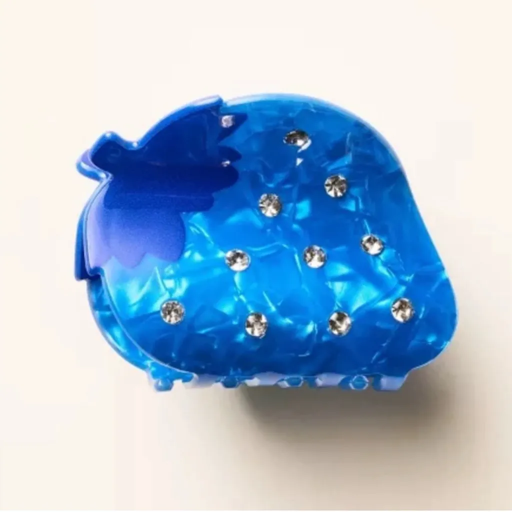 Strawberry-shaped hair clip in blue with sparkling rhinestones. Stylish accessory by Kate Spade. D3