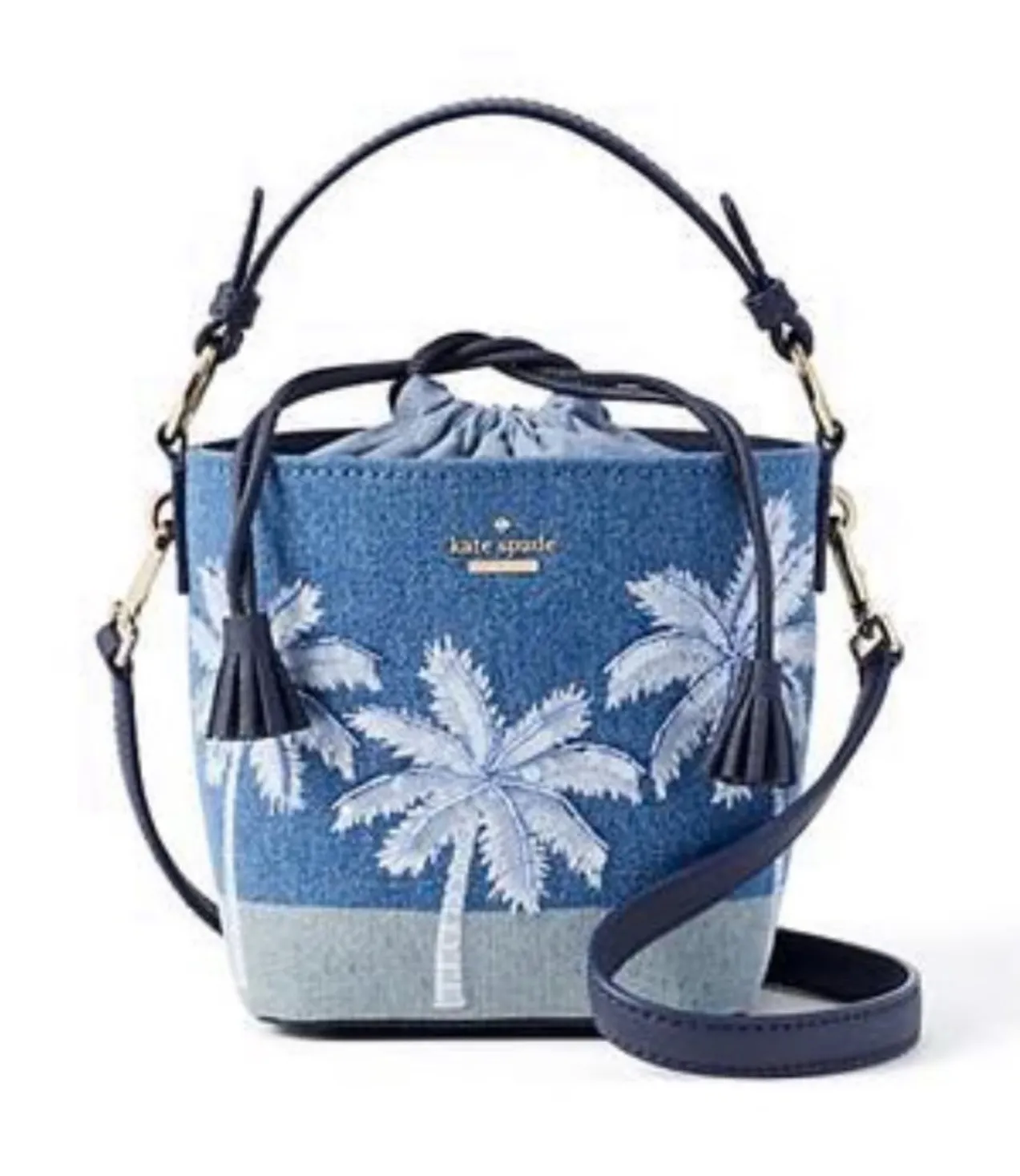 Kate Spade California Dreaming Pippa Blue Denim Palm Tree Bucket Bag The vibrant blue denim of the... Show more