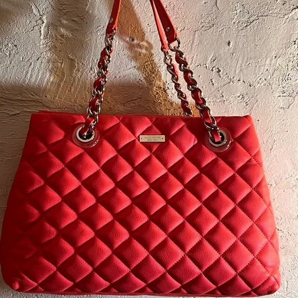 This stunning shoulder bag by Kate Spade showcases a vibrant orange hue, enhanced by a luxurious qui... Show more